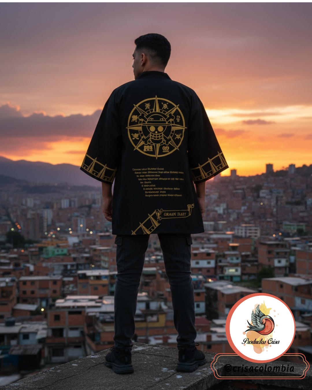 El Kimono One Piece «Sombrero de Paja» de Productos Crisa es una prenda imprescindible para los fans más leales de Monkey D. Luffy y la épica tripulación de los Sombrero de Paja. Confeccionado en lino flex de excelente calidad, este kimono ligero de color negro presenta un diseño audaz con el icónico Jolly Roger de los Piratas del Sombrero de Paja en dorado en la espalda, acompañado de elementos náuticos y el lema «Grand Line». Es la forma perfecta de encarnar la libertad, la aventura y la determinación de Luffy y sus nakamas, combinando un confort moderno con un diseño reconocible y evocador.